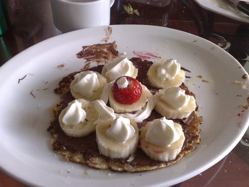 Quest’ultimo è uno dei tanti pancake ipercalorici che ci siamo pappati in occasione del brunch organizzato dalla Made una decina di giorni fa… madonna che buoni!!! Ingredienti principali: immancabile nutella, marmellata, latte condensato, banane, fragole e taaanta panna montata! 😛